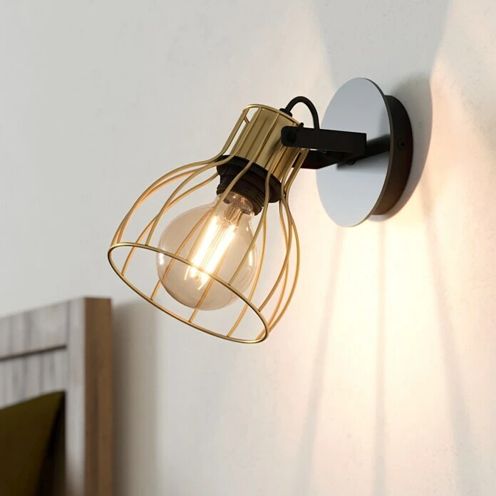 Die Wandleuchte SAMBATELLO ist aus schwarzem Metall mit einem beweglichen, messing-gebürstetem Spot aus Draht gefertigt. Die Wandhalterung der Leuchte wurde mit einer schwarzen Holzdekor-Platte kombiniert. Durch den Lampenschirm entstehen faszinierende Licht- und Schattenspiele, sobald der Wandspot eingeschaltet ist. Die Wandlampe rundet Einrichtungen im Industrial-Stil ab und bietet dank des schwenkbaren Leuchtenkopfes eine gezielte Ausleuchtung im Raum – egal ob in der Küche, im Wohnzimmer, Schlafzimmer oder Flur. Das abgebildete Filament-Leuchtmittel ist nicht im Lieferumfang enthalten. Geeignet ist die Leuchte für jedes Leuchtmittel mit E27-Sockel.