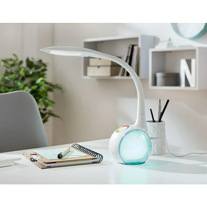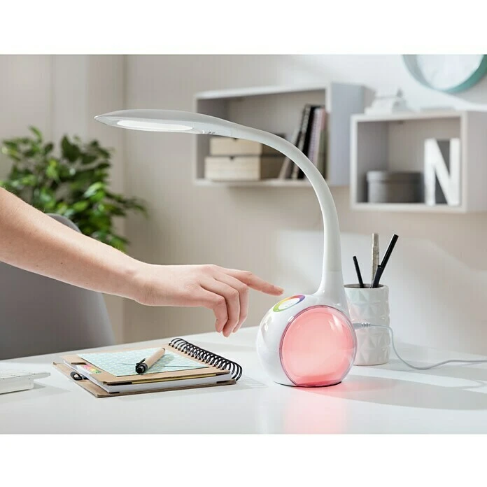 Die Globo LED-Tischleuchte hat ein außergewöhnliches Design komplett in weiß, mit weichen Formen. Ein Highlight ist der kugelförmige, beleuchtbare Sockel, dessen Farben wechsel- und fixierbar sind. Hierdurch entstehen schöne Farbspiele. Außerdem kann diese moderne Tischleuchte über einen Touchdimmer reguliert werden, womit eine optimale Bestimmung des Lichtbedarfs sichergestellt ist. Der Flexarm ermöglicht eine effektive Ausrichtung. Diese Leuchte ist als Arbeitsleuchte, Designleuchte und auch Nachttischleuchte einsetzbar. Das verbaute RGB-LED Leuchtmittel im Sockel ist mit jeweils 0,1 Watt äußerst energiesparend. Das Leuchtmittel im Schirm ist mit einer Leistung von 5 Watt ebenfalls sehr energiesparend.