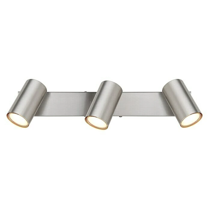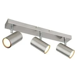 Dieser schlichte Strahler der Robby Serie begeistert durch Design und Farbgebung. An einer rechteckigen Deckenhalterung (41x6cm) befinden sich drei GU10 Fassungen, bedeckt von jeweils einem zylinderförmigen Schirm in matten Nickel. Die GU10 Fassung, ermöglicht Ihnen die freie Wahl an Leuchtmitteln, bis zu einer maximalen Leistung von 35 Watt.