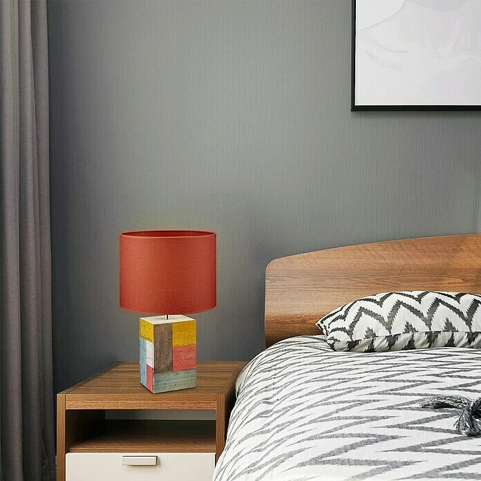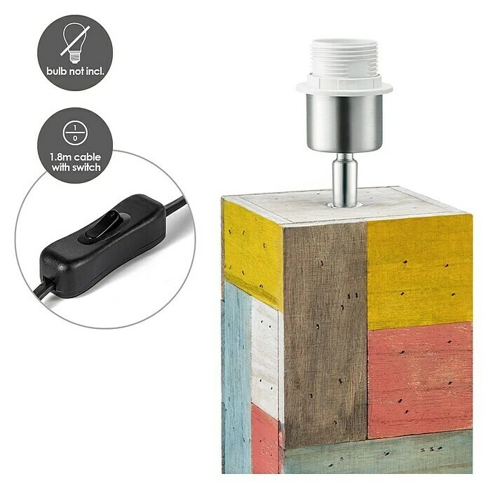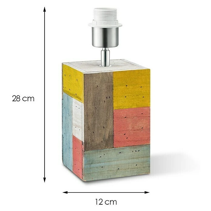 Der Home Sweet Home Lampenfuß Tora überzeugt mit seiner Verarbeitung aus Holz und der modernen Optik mit buntem Muster aus Rechtecken. Hierdurch entsteht der Eindruck als sei der Sockel aus einzelnen, bunten Holzstücken zusammengesetzt. Der Lampenfuß kann mit passenden Lampenschirmen mit einem maximalen Durchmesser von 20 Zentimetern für ein individuelles Design kombiniert werden. Es ist für Leuchtmittel mit E27-Fassung und maximal 40 Watt der Energieeffizienzklassen von A++ bis E geeignet. Hierdurch kann Helligkeit und Strahlkraft nach individuellen Wünschen über die Auswahl des Leuchtmittels beeinflusst werden. Des Weiteren kann der Lampenfuß bequem durch einen Schalter an- und ausgeschaltet werden.