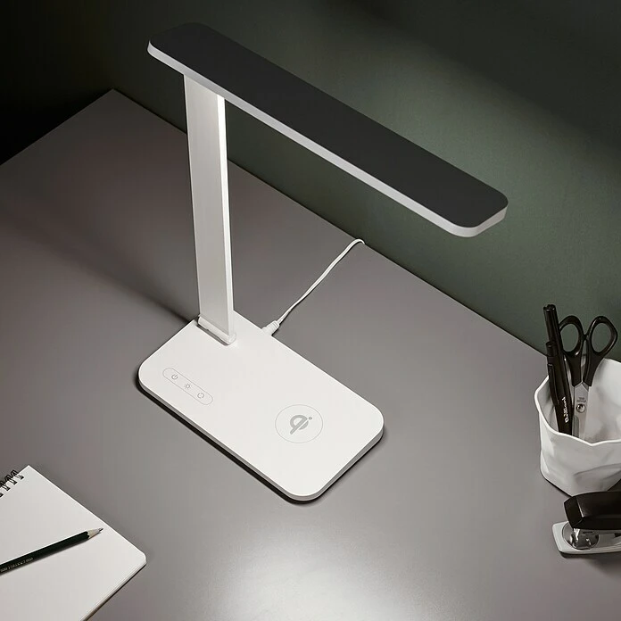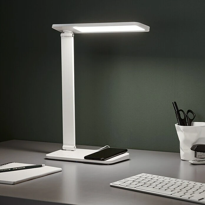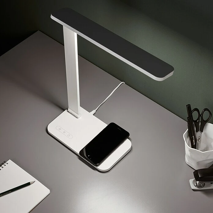 Die Brilliant LED-Tischleuchte Seamont überzeugt durch ihr modernes Design und effiziente Beleuchtung für den Arbeitsplatz. Die Tischleuchte verfügt über eine integrierte induktiv-Lade-Funktion, über das das kompatible Smartphone bequem am Schreibtisch aufgeladen werden können. Per Touchfunktion ist die Leuchte von 3.000 Kelvin bis 6.500 Kelvin dimmbar, wodurch sich die Helligkeit nach individuellen Bedürfnissen anpassen lässt. Über den schwenkbaren Kopf ist die Leuchte optimal ausrichtbar. Die Tischleuchte Seamont ist in den Farben Schwarz und Weiß erhältlich.